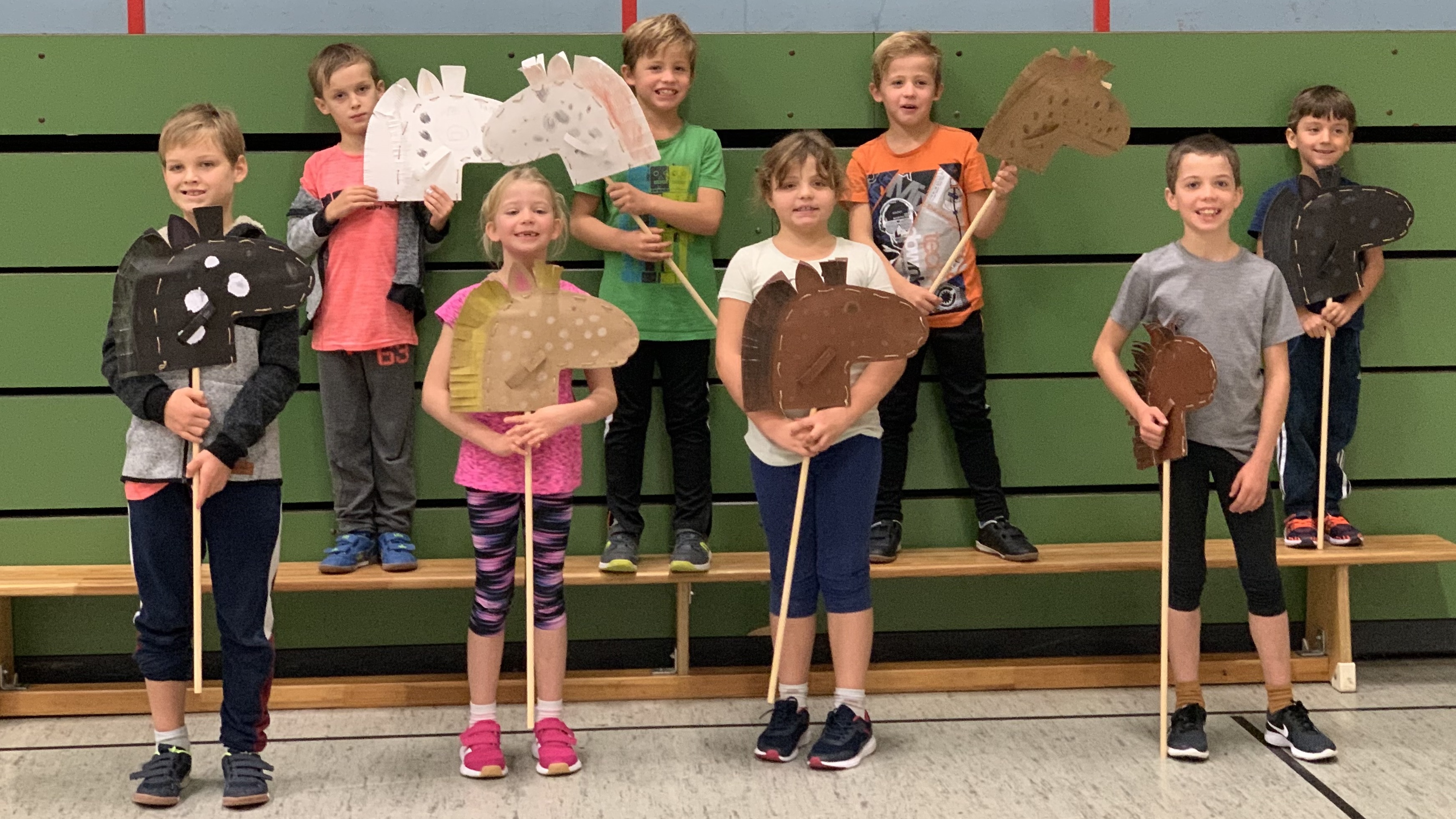 Dienstags entschieden wir uns aufgrund des schönen Herbstwetters auf den Sportplatz zu gehen. Dort durchliefen die drei Gruppen mehrere Stationen, in denen beispielsweise Dosenwerfen oder Lauf-Memory gespielt wurden. Am Mittwoch war dann basteln angesagt. Jedes Kind bastelte sich an diesem Tag ein eigenes Steckenpferd welches am Donnerstag seine Verwendung finden sollte: „Hobby-Horsing“ stand auf dem Programmplan. In einer der drei Hallenteile der Turnhalle in der Kastanienallee wurde ein Parcour, ähnlich wie beim Springreiten, aufgebaut, welchen die Kinder mit ihrem Steckenpferd reiten durften.