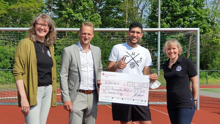 von links: Elisabeth Schäfer, 2. Vorsitzende; Stefan Ewert, Filialleiter Kreissparkasse; Orwah Ammouri, Trainer Leichtathletik; Alessandra Rizzo, 1. Vorsitzende
