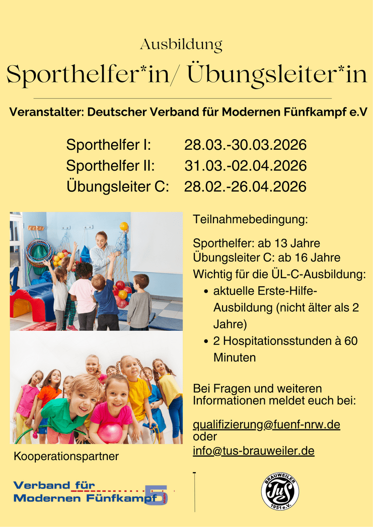 In Kooperation mit dem Verband für Modernen Fünfkampf NRW bieten wir in der Zeit vom 28.02. – 26.04.2026 die Ausbildungen zum Sporthelfer I und II und zum Übungsleiter*in C sportartübergreifend Breitensport an.