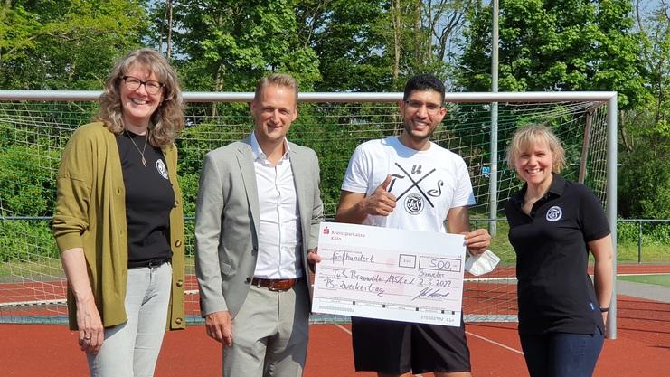 von links: Elisabeth Schäfer, 2. Vorsitzende; Stefan Ewert, Filialleiter Kreissparkasse Köln; Orwah Ammouri, Trainer Leichtathletik; Alessandra Rizzo, 1. Vorsitzende